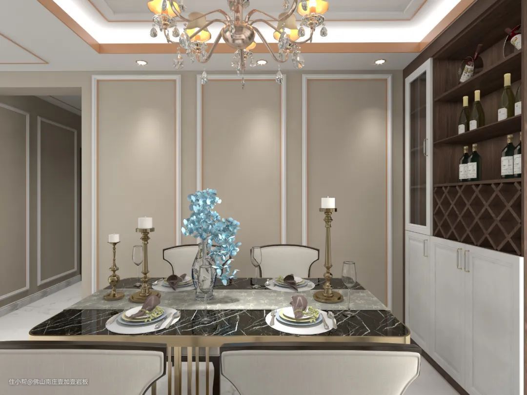 餐厅优雅且大气,吊顶的设计既充满时尚感同时也让整个空间极具层次感,金属岩板台面的餐桌结合优雅的布艺座椅,凸显欧式的奢华与浪漫气质,与旁边棕白色酒柜相辅相成,让整个空间极具格调。
