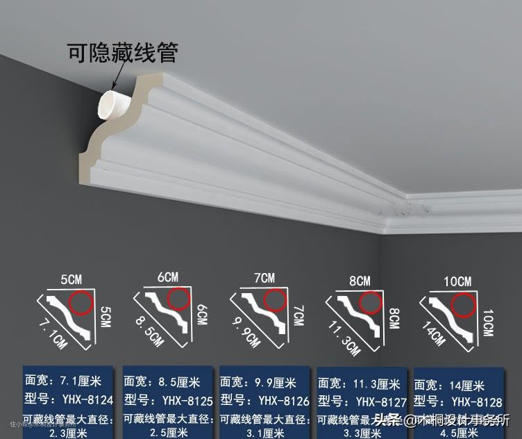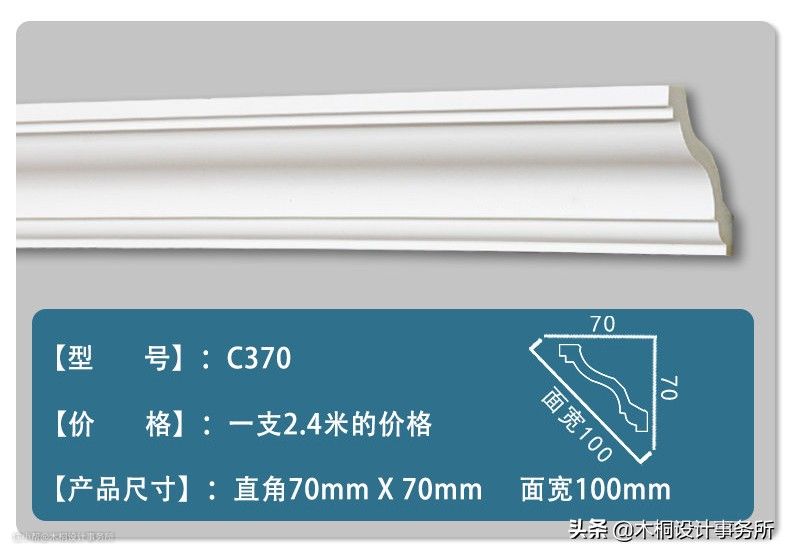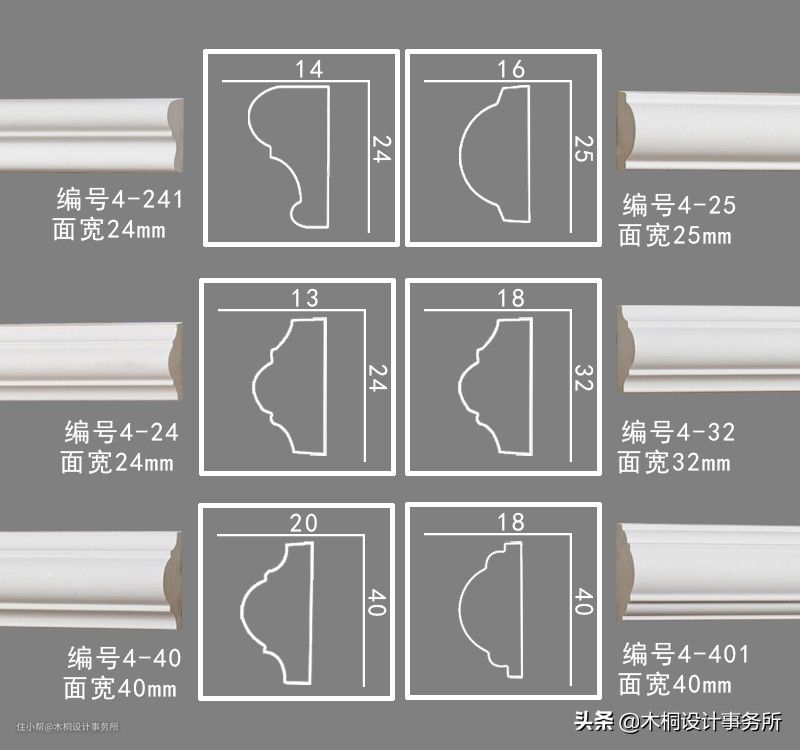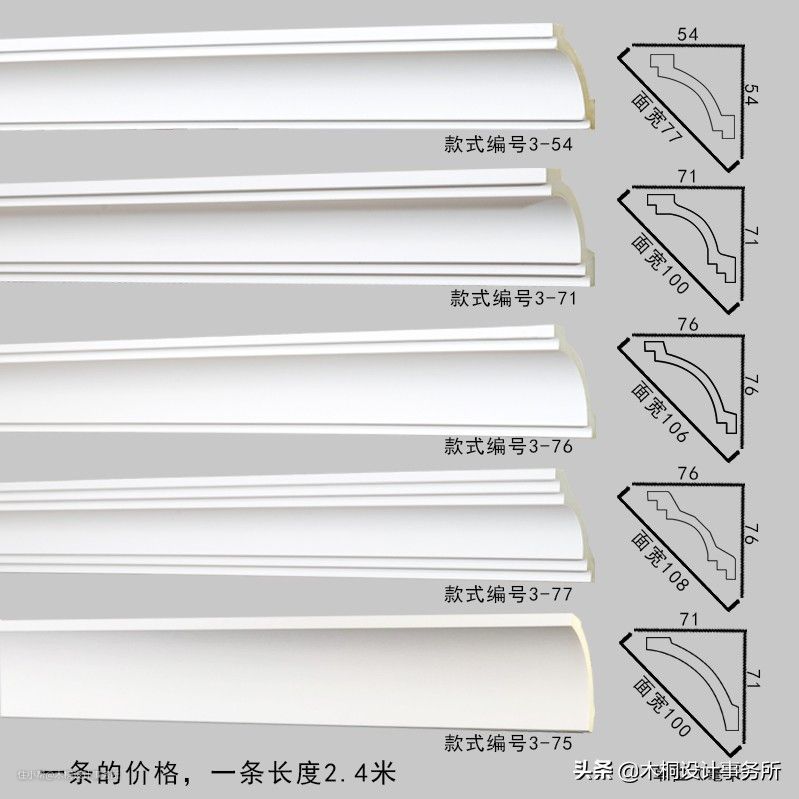 常用于墙面和顶面的造型,40mm和60mm的最为常见,常配合角花一块使用。
