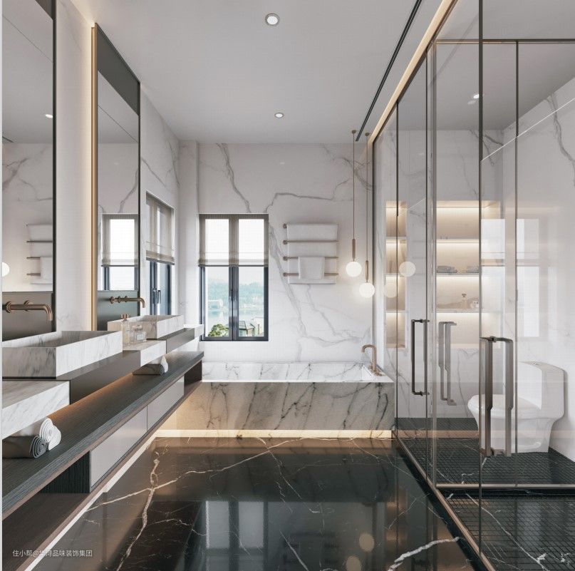 卫生间使用黑白两种仿大理石瓷砖,对地面和墙体进行铺装,搭配上温和的灯光,营造出华丽的空间感受。