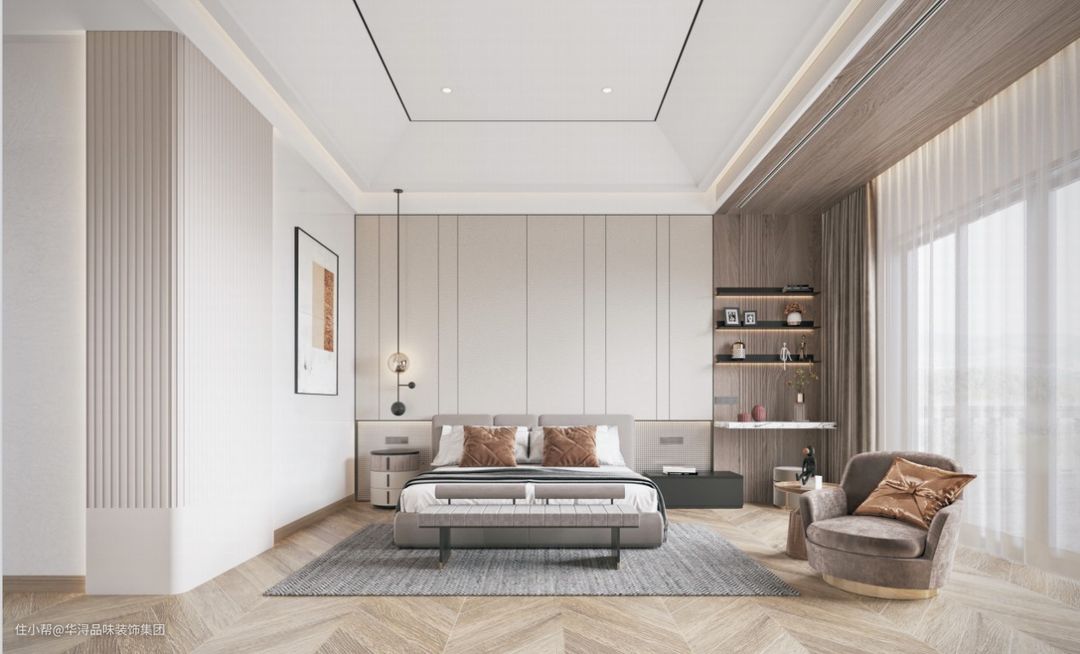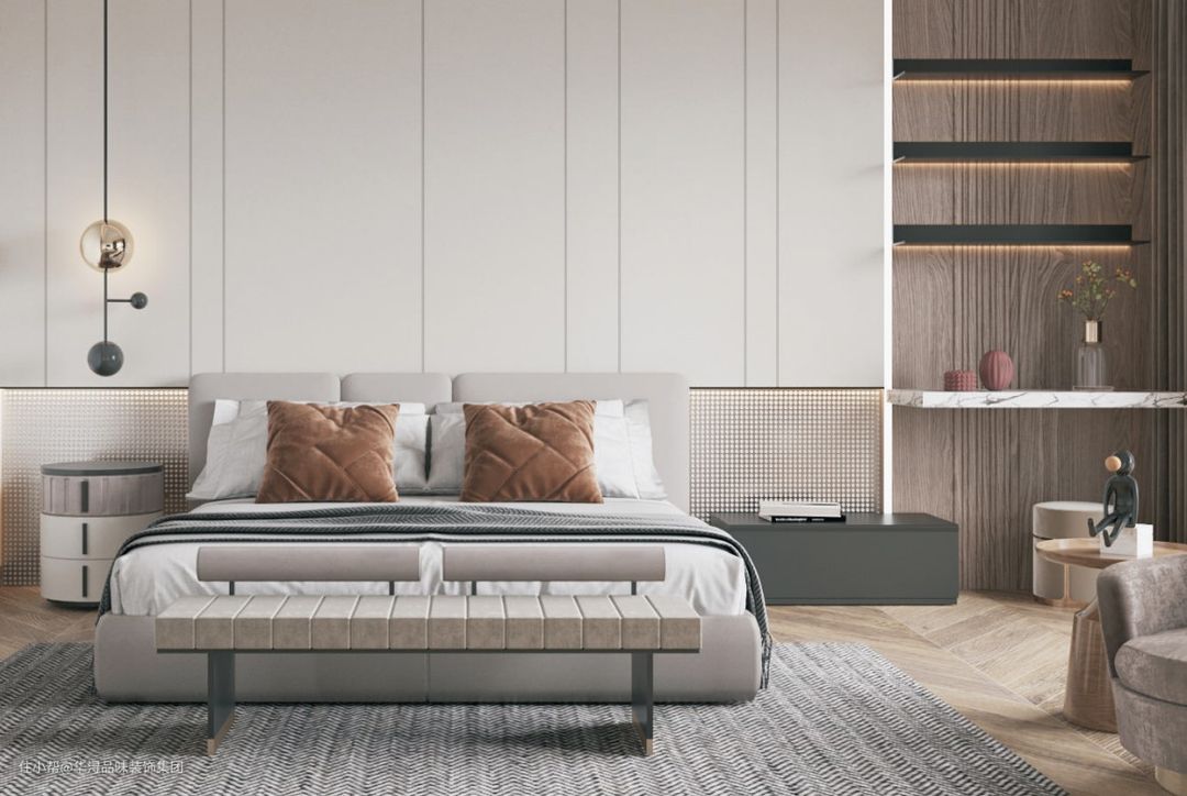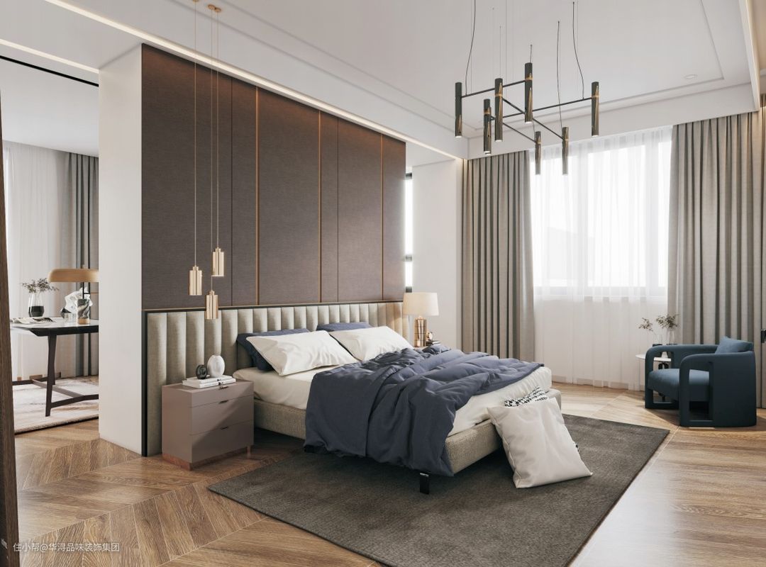 和客厅、餐厅等空间不同,主卧室换装了实木地板,床头背景墙也是用了颜色更深、更偏暖的深棕色,在视觉上给人更温暖的感觉,这种环境能让人更容易放松,获得更好的休息。