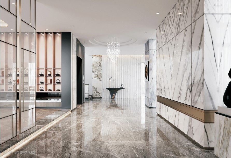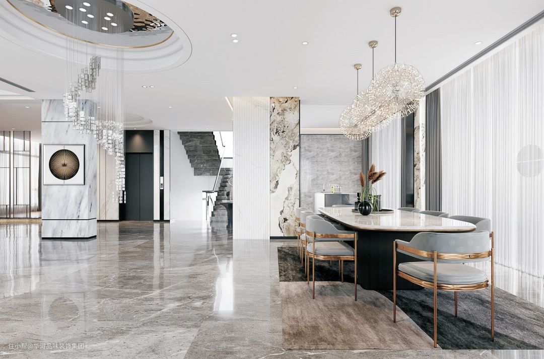 装饰材料:大理石、瓷砖、玻璃、实木地板、水晶吊灯、岩板、硅藻泥、硬包等