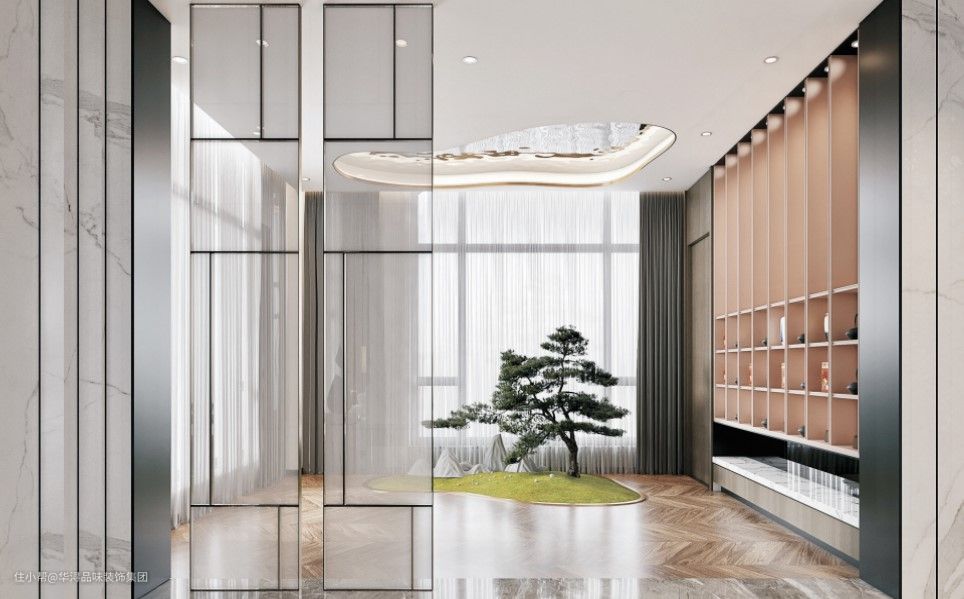 树的旁边还搭配上假山造型的石头,小花园的上方同样做出了不规则造型的吊顶进行呼应,打造出了自然清新且具有禅意的室内景观空间。