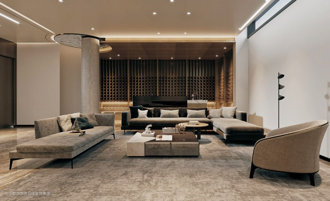 负一层的客厅空间比较私密,因此设计师将这里设计为业主和家人的专属空间,设计师在这里布置了大量暖黄色灯光,烘托出温馨、浪漫的空间氛围。