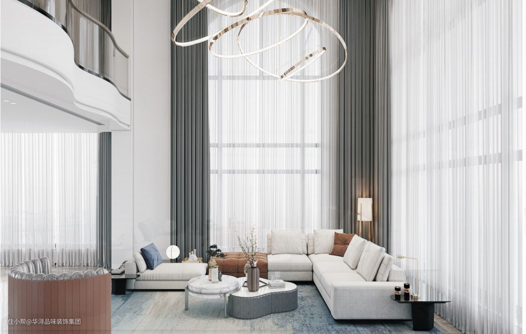 客厅以白色作为主色调,给人干净的感觉,两侧巨大的落地窗搭配上半透明的窗纱,让客厅更有朦胧美,显得客厅更加优雅,有气势的同时不落俗套。