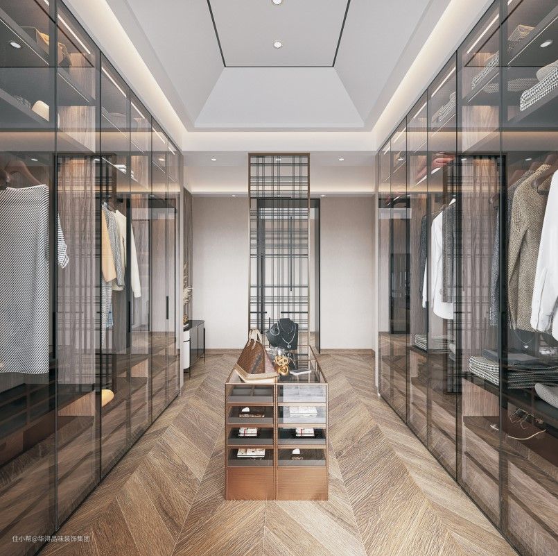 衣帽间中设计了两排通顶式大衣柜,储存量巨大,可以存放下业主所有的衣物。这些衣柜都使用玻璃门板,配合上柔和的灯光显得格外时尚大气。