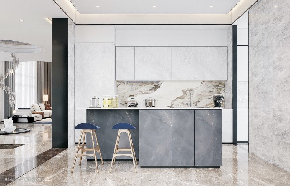 这套新房的厨房设计成开放式,在厨房的前方还设计了一组岛台,不仅可以增加厨房操作台面的面积,还可以搭配吧凳,作为业主的休闲空间使用。