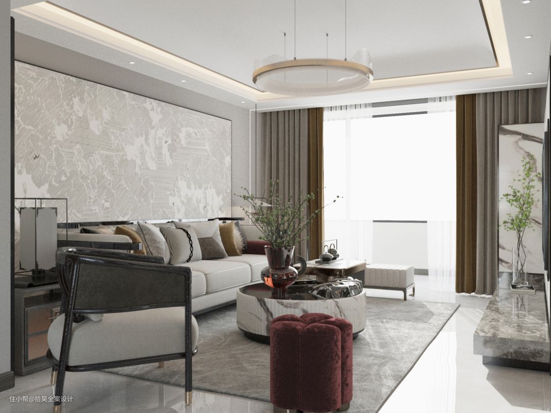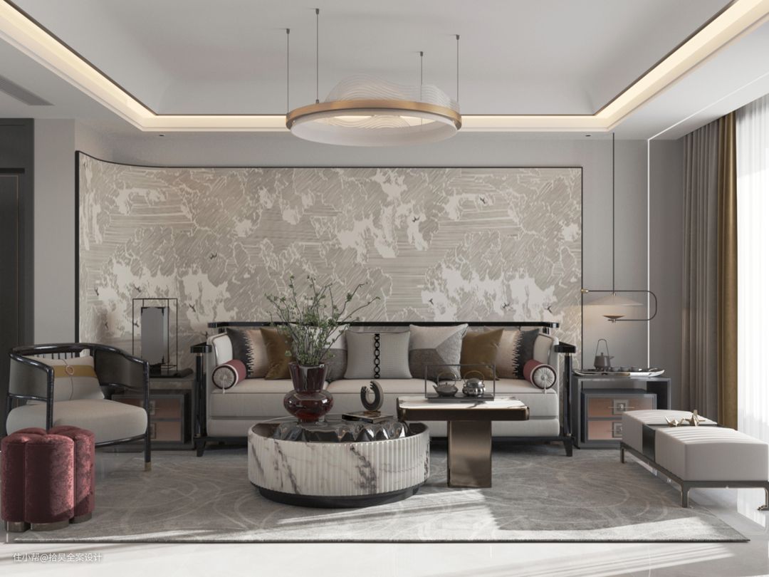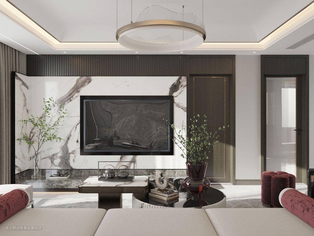 119平新中式,岩板电视墙设计,契合栅格纹理,更显文化底蕴
