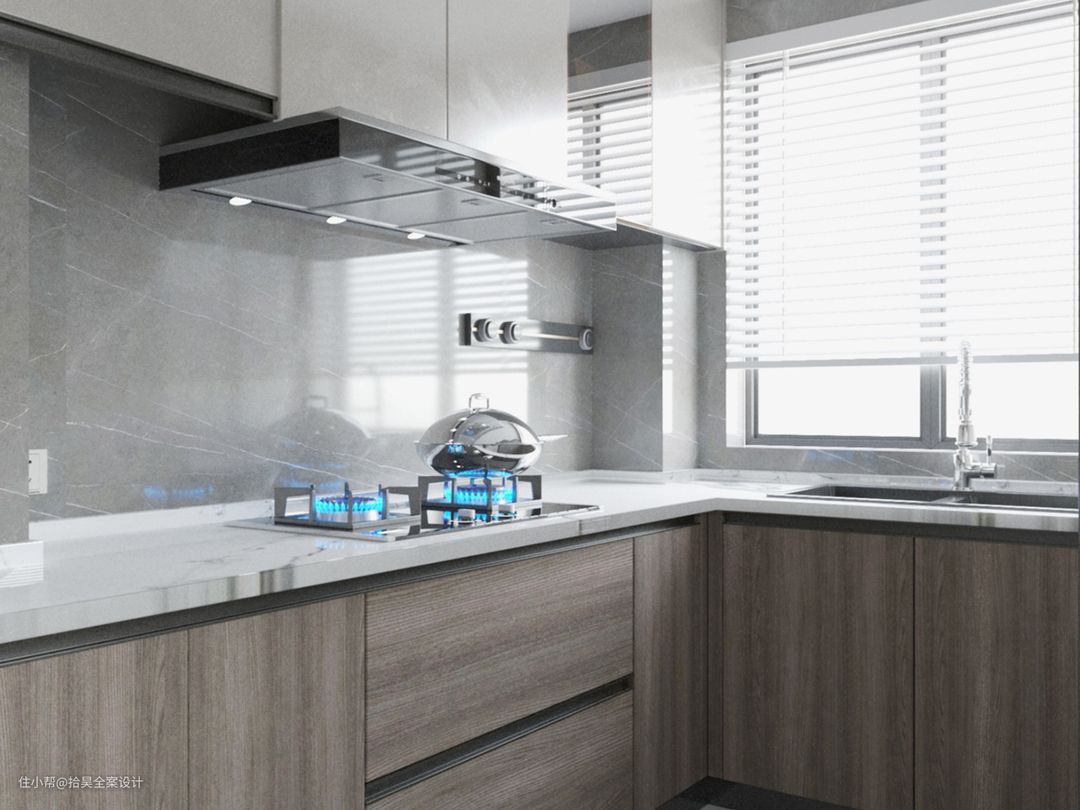厨房新中式风格装修效果图,采用的是L型的橱柜布局设计,在灰色墙面的空间基础上,厨房的烹饪台使用了白色的石英石材料,结合原木色的橱柜和挂柜,窗户配有百叶窗,现代优雅的空间感,使烹饪也有了舒适轻松的体验。