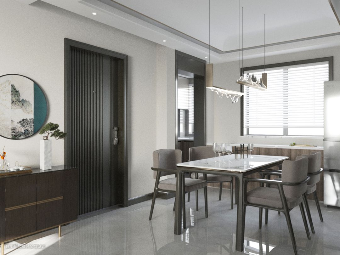 餐厅新中式风格装修效果图,餐厅靠窗做了一排橱柜台面,拓展了厨房的收纳能力,冰箱被放置在餐厅里面,保证了厨房有足够的操作空间。
