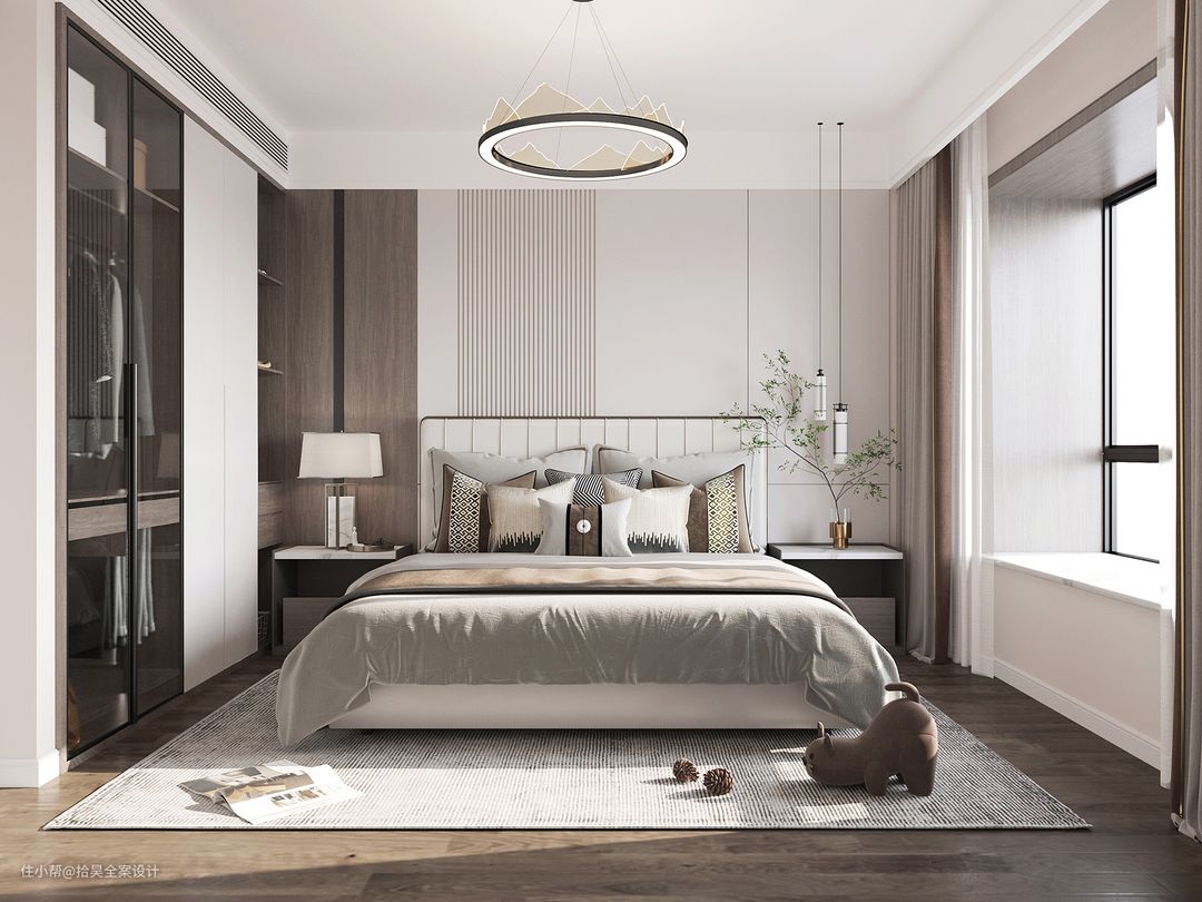 主卧新中式风格装修效果图,床头背景墙做了木饰面的组合设计,同时与定制衣柜连为了一体。时尚的玻璃柜门凸显出高级质感,通透大气。