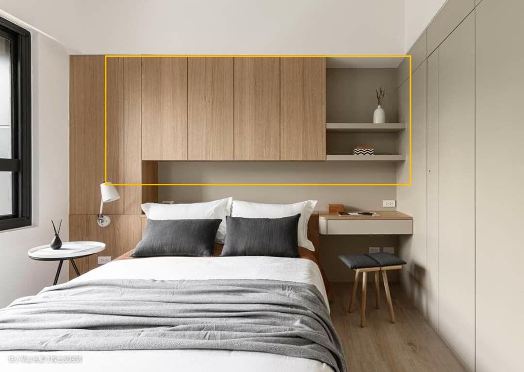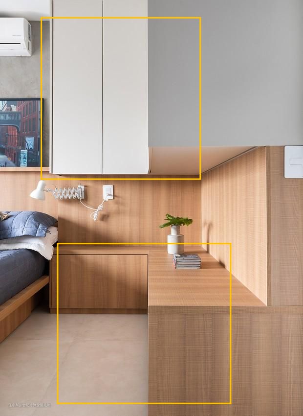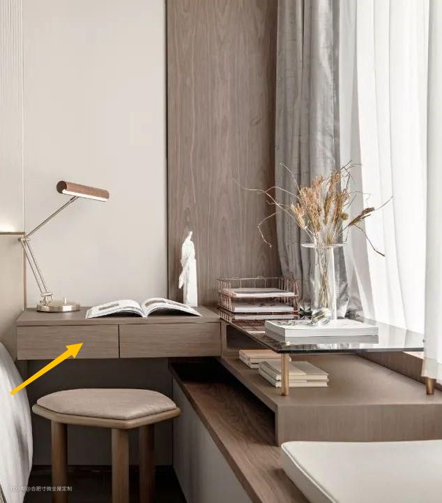 更可以直接舍弃床头柜,用悬空书桌代替,空间利用率更高;需要注意的地方:书桌与床的高度相差不要太大,否则就失去了代替床头柜的意义。