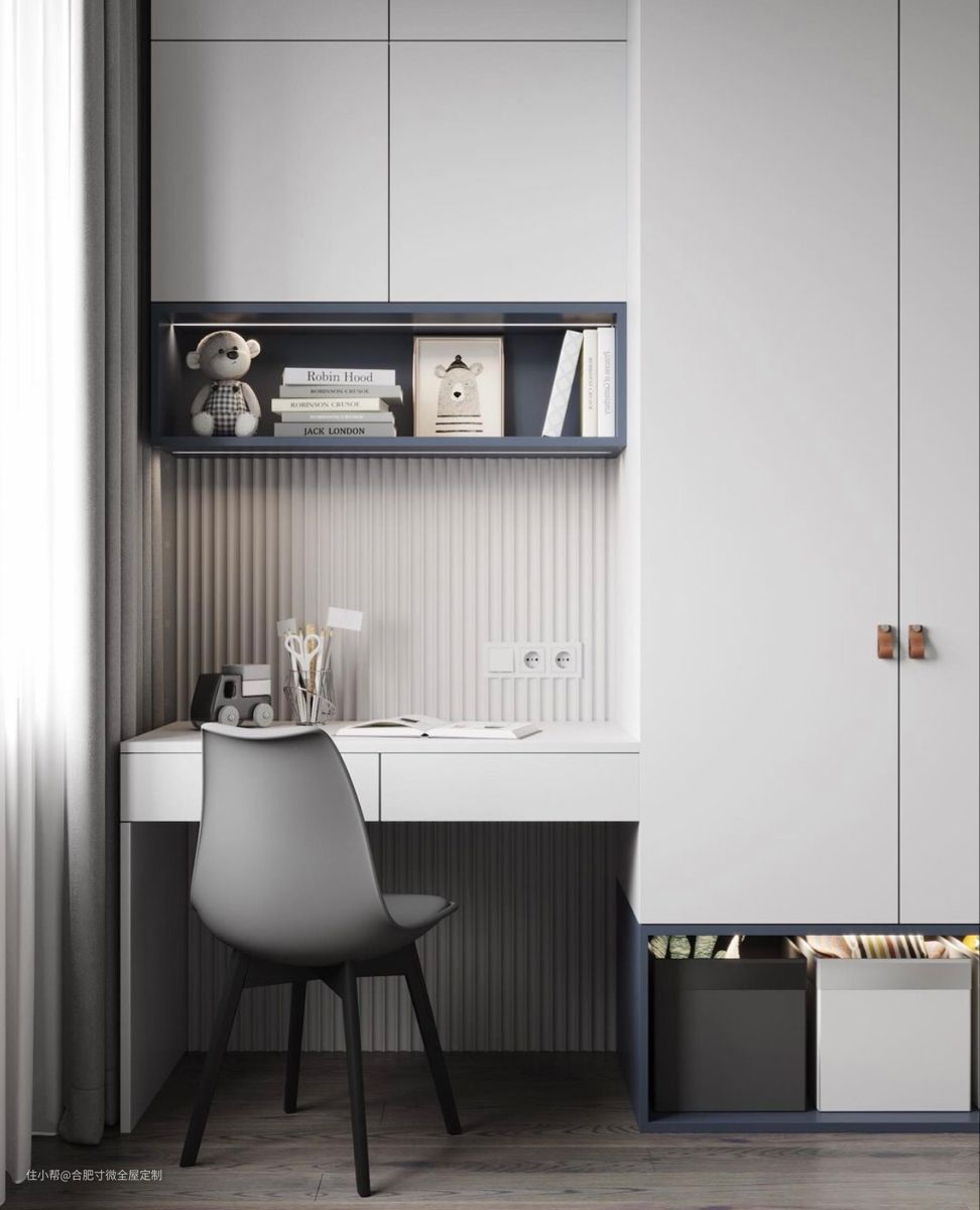 这种一体式除了延长以外,还可以做内嵌式,在衣柜旁留空,做一个内嵌式书桌,书桌下方做抽屉收纳,上方用隔板做出书架,这样既有工作台功能,又有收纳展示功能。