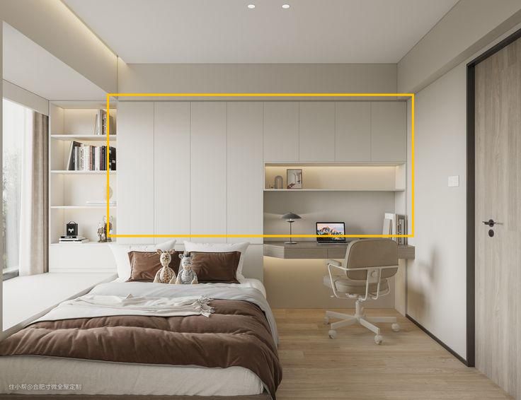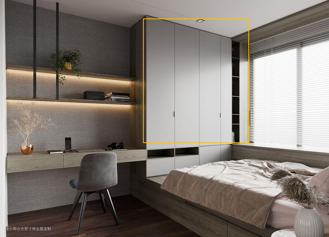 卧室常见的还有衣柜书桌一体化定制,充分利用空间,让小空间更有延伸感。内侧开放格可以放置日常读物,一门到顶的设计,收纳功能强大。