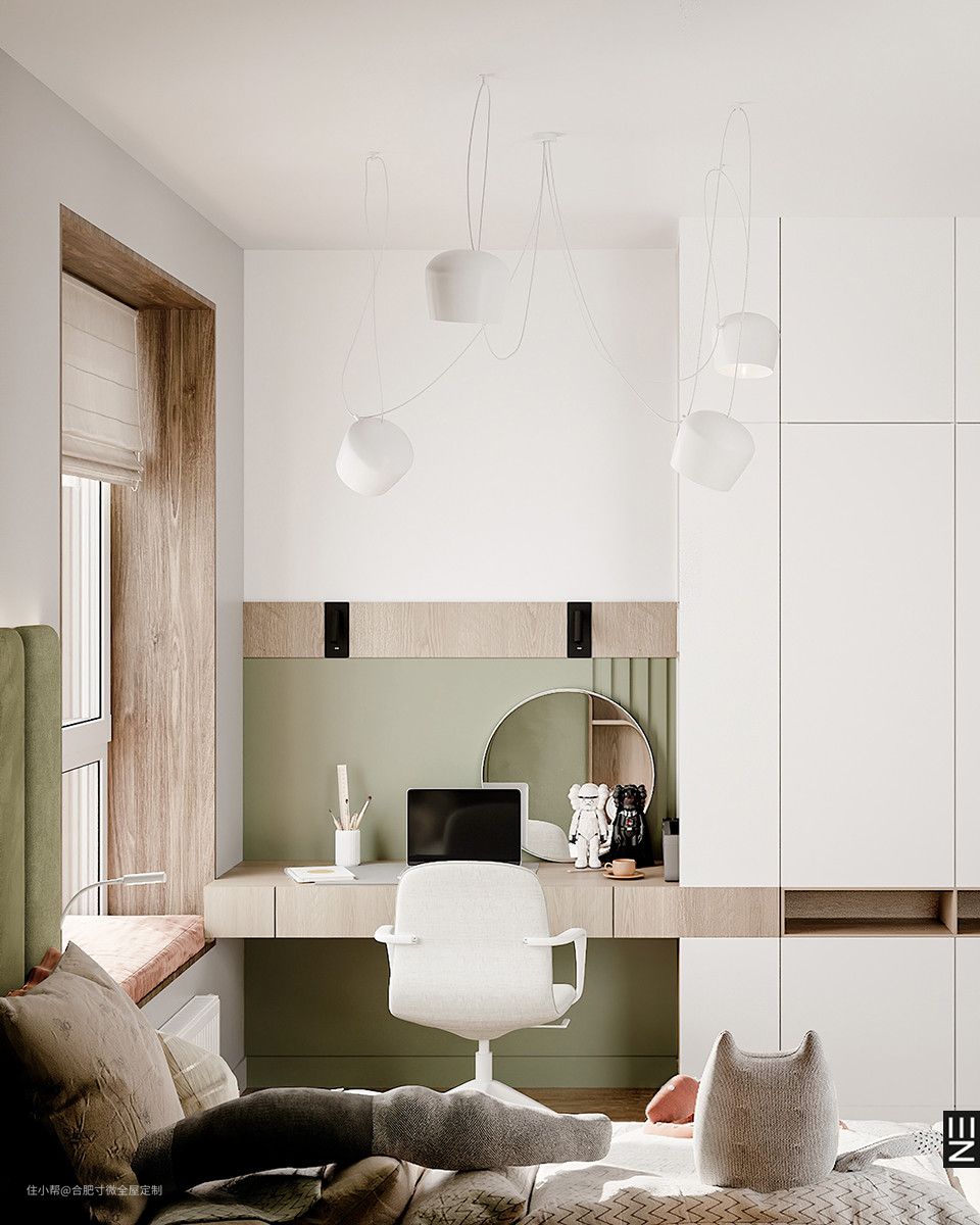 当然也不仅局限与床头,床尾也可以,衣柜下方留空做内嵌式书桌,如果在床头的话书桌还可以当床头柜使用,真“一柜多用”!房间虽小,但卧室、书房、衣柜功能一个不少。