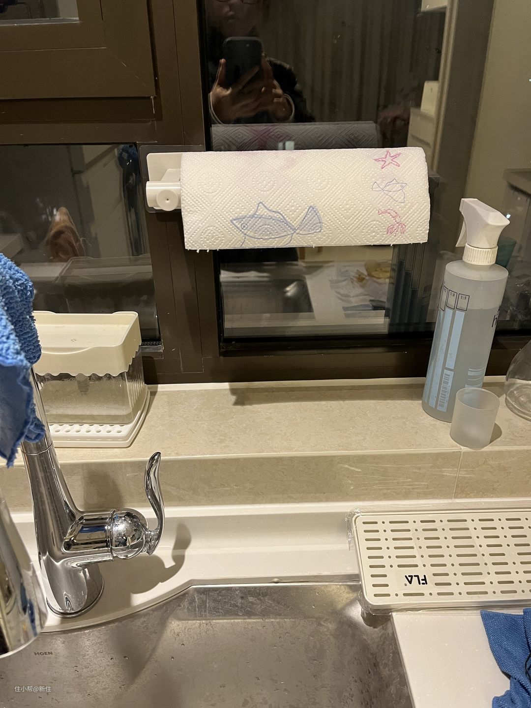 一个简单的L型伸缩挂钩就能解决,粘贴在墙面上,根据厨房纸长度调整伸缩杆,简洁省地儿。