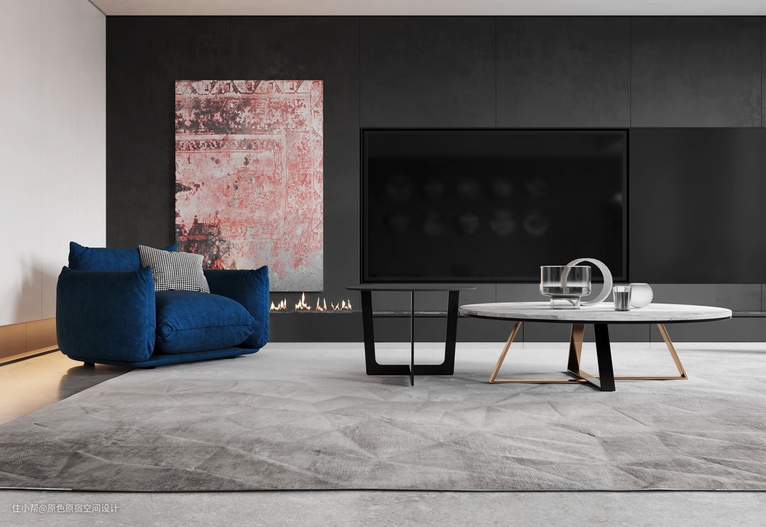 沙发与装饰画的跳色鲜明夺目,打造艺术氛围,电视内嵌与电视墙融为一体,轨道灯作为主要光源,同样起到视觉上的简化作用。
