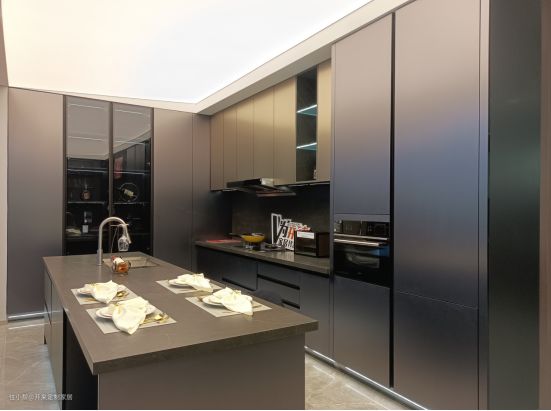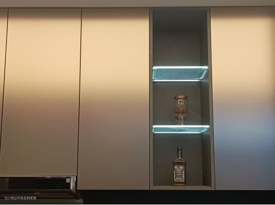 此次案例属于现代简约轻奢风,采用银河白灰系门板,搭配璀璨金错色错层,整体低调又亮眼。