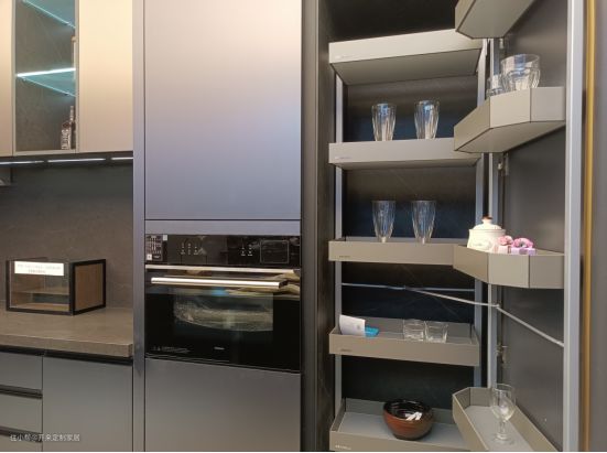 西厨区设计高柜嵌入电器,上下方可分类收纳西厨用具及食材,高柜门内设半高联动拉篮,钢制金属质感,拉开门瞬间高级感十足。
