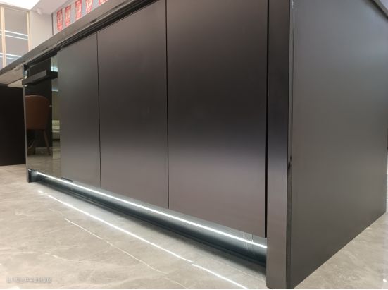 双开门玻璃柜采用黑色极窄边框灰玻璃门,可透带有纹路的灰色库卡岩柜体,打造出一个精致储酒区,满足高端住宅业主聚会应酬之需。