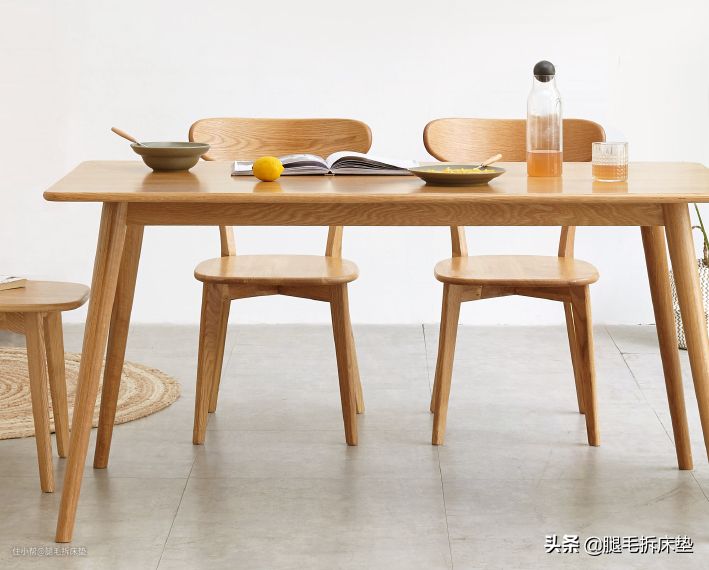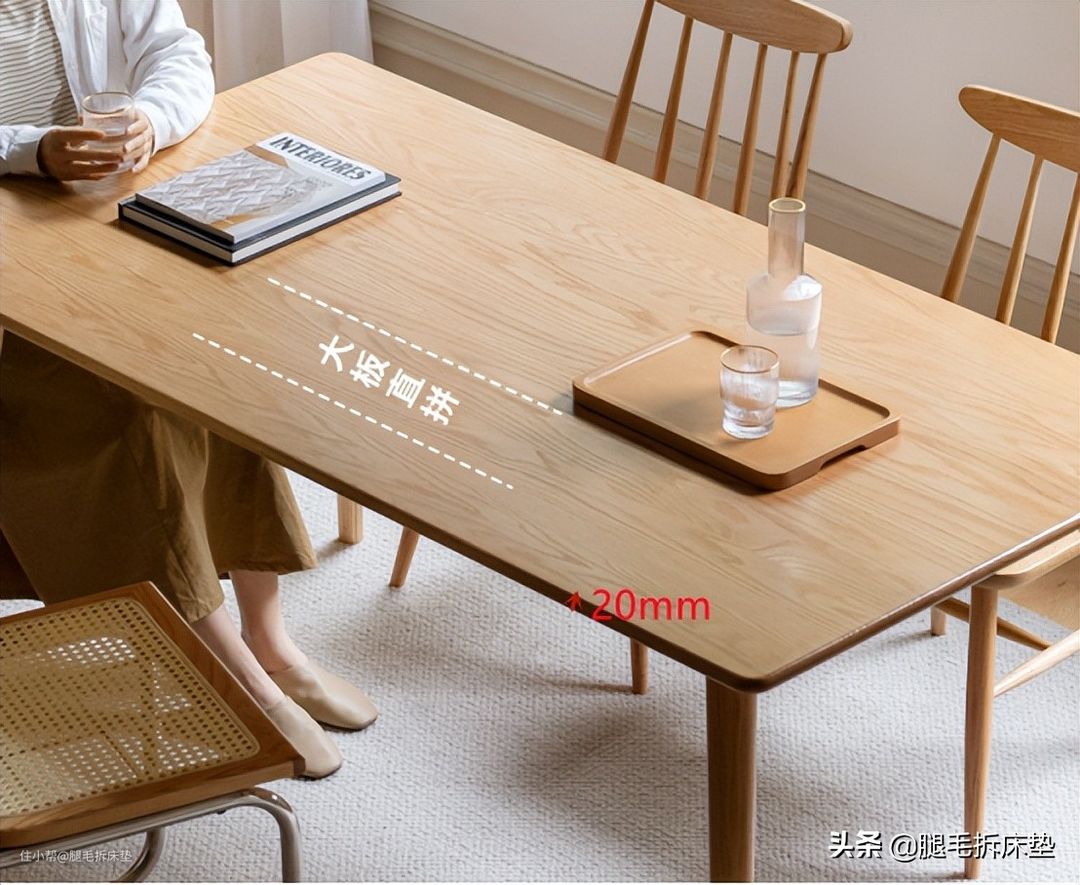 材质都是北美FAS级橡木,20cm的桌面用大板直拼,这种加工方式,不仅保证了纹理美观,还提升了餐桌的使用寿命(小科普:用一整张木头做桌面,随着环境湿度的变化,它非常容易开裂,这是正常现象)。