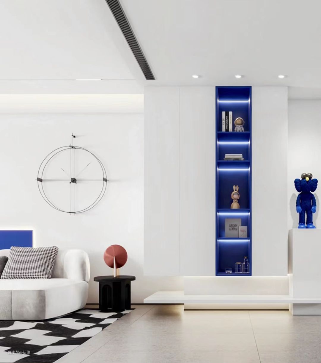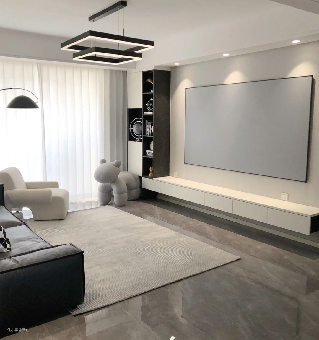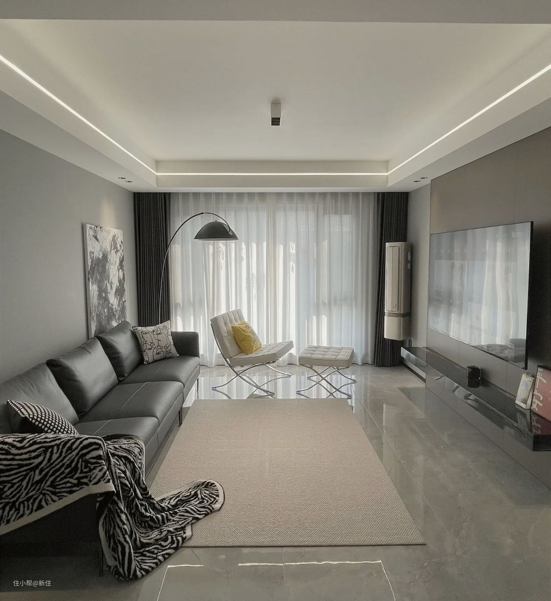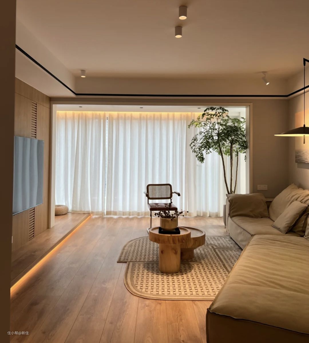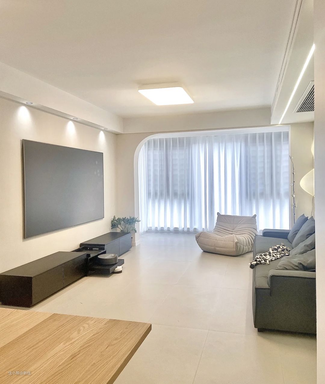 吊大平顶做无主灯、岩板电视墙、嵌入式踢脚线、无框通顶门,甚至全屋微水泥。