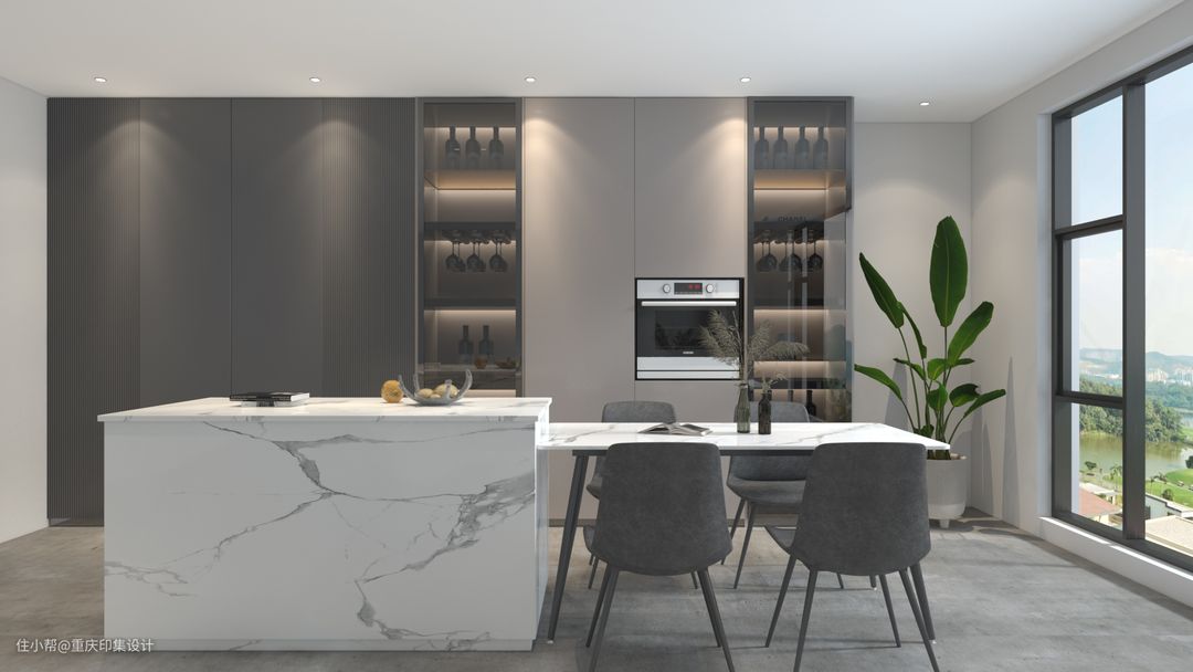 满壁定制柜体用做收纳与橱窗展示,使用部分嵌入电器,搭配灯光氛围,呈现时尚现代感;大理石岛台与岩板现代餐桌搭配,实现西厨及餐厅功能。