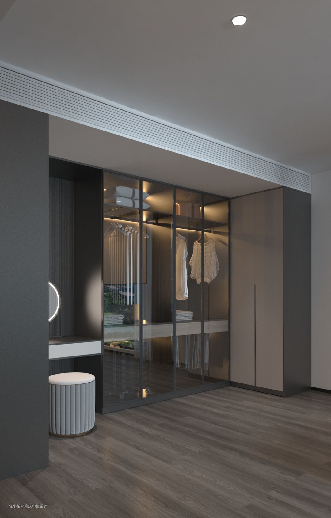 左侧衣柜与梳妆台组合的衣帽间,镜面与无把手柜门设计,彰显现代简约感。