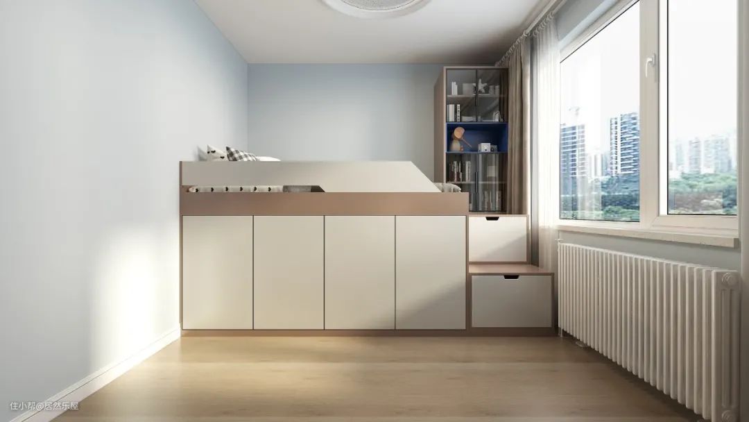儿童房选用了浅蓝色调,定制的榻榻米,下柜上床,满足了小朋友储物学习,休息的功能。