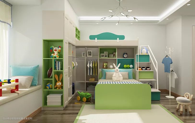 二娃家庭越来越多,上下床儿童房设计可以省出一间房空间,内嵌式衣柜、楼梯柜等一体化设计,同时满足储物、玩乐、学习等多种需求,小户型家庭的必备之选。