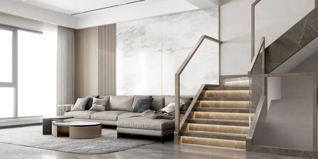 『四周吊顶』客厅面积比较大,就可以在四周做吊顶,然后根据空间规划,把中央空调装在任意一边的吊顶上面。