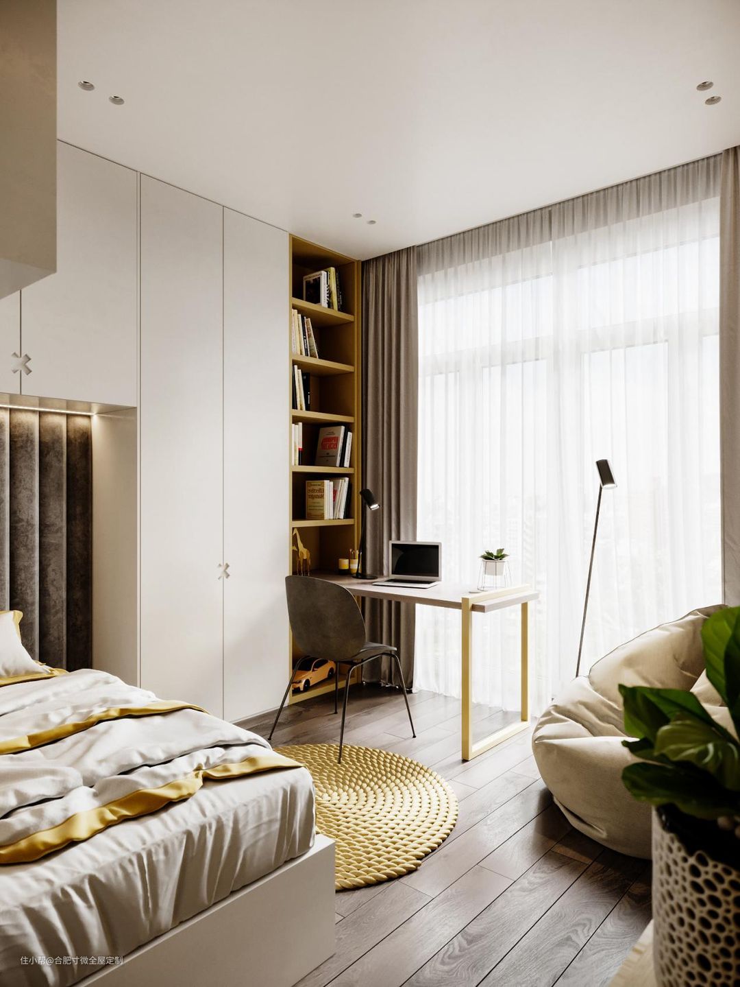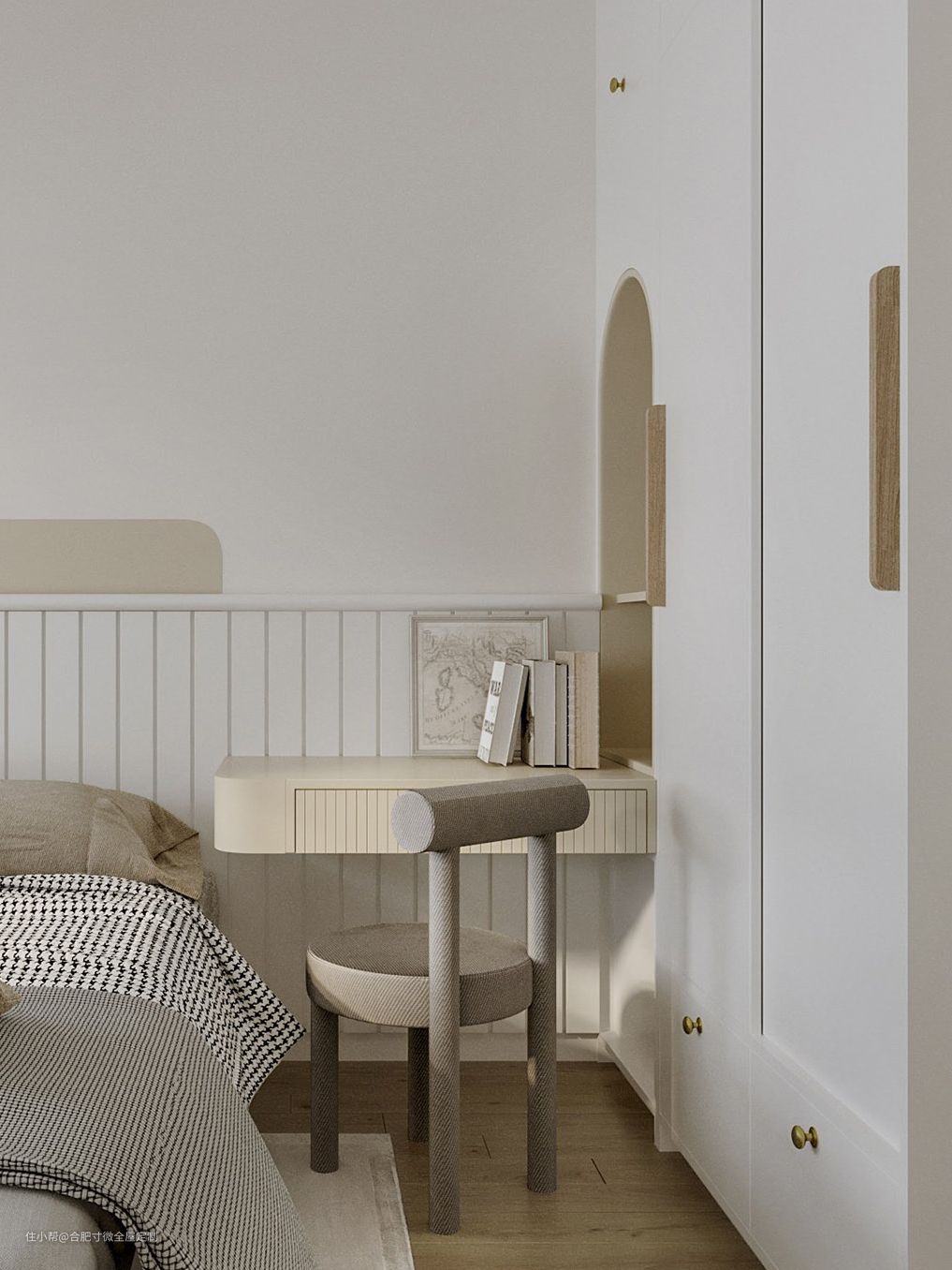 或者直接舍弃床头柜,用延长书桌代替,空间利用率更高;如果觉得造型单调,可以给旁边书架做个圆拱门的造型,需要注意的地方:书桌与床的高度相差不要太大,否则就失去了代替床头柜的意义。