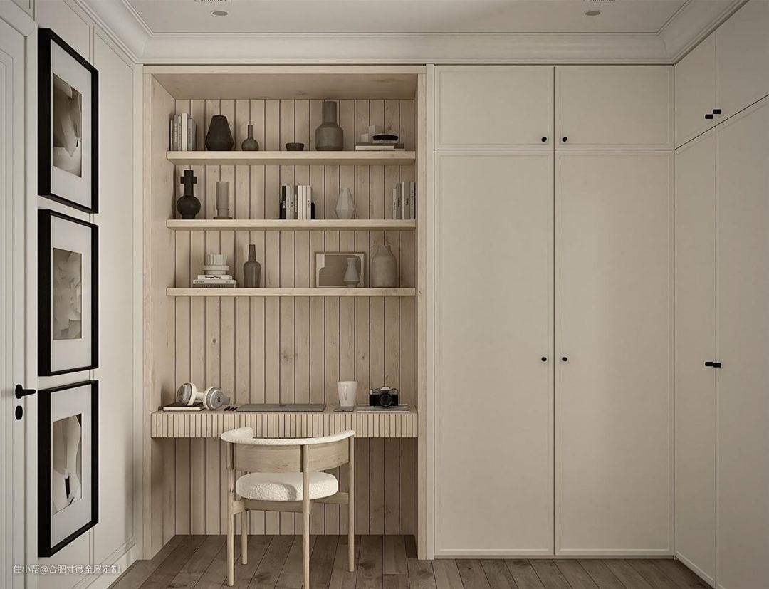 在衣柜旁留空,做一个内嵌式书桌,颜色选择和书桌同色系或者一致,让书桌和衣柜融为一体;书桌下方做抽屉收纳,上方用隔板做出书架,这样既有工作台功能,又有收纳展示功能。