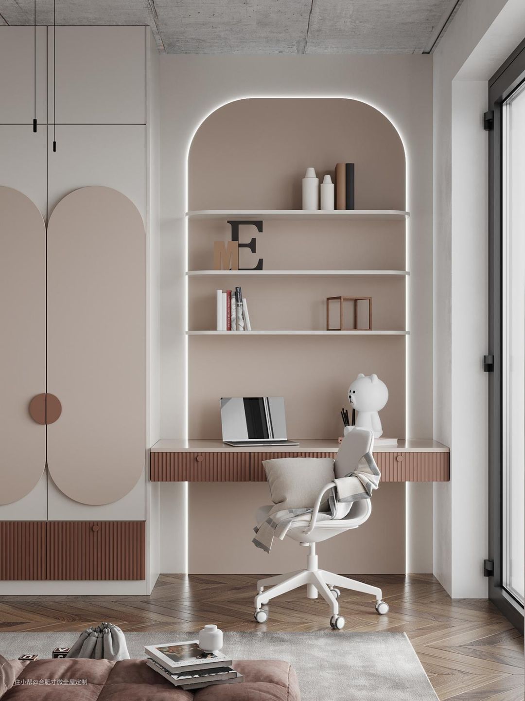 为了避免孩子误撞桌角受伤,可以把桌角做成圆润的弧形,再搭配柜体清雅的线条,整体美观且气质佳,孩子在这里都会爱上学习。