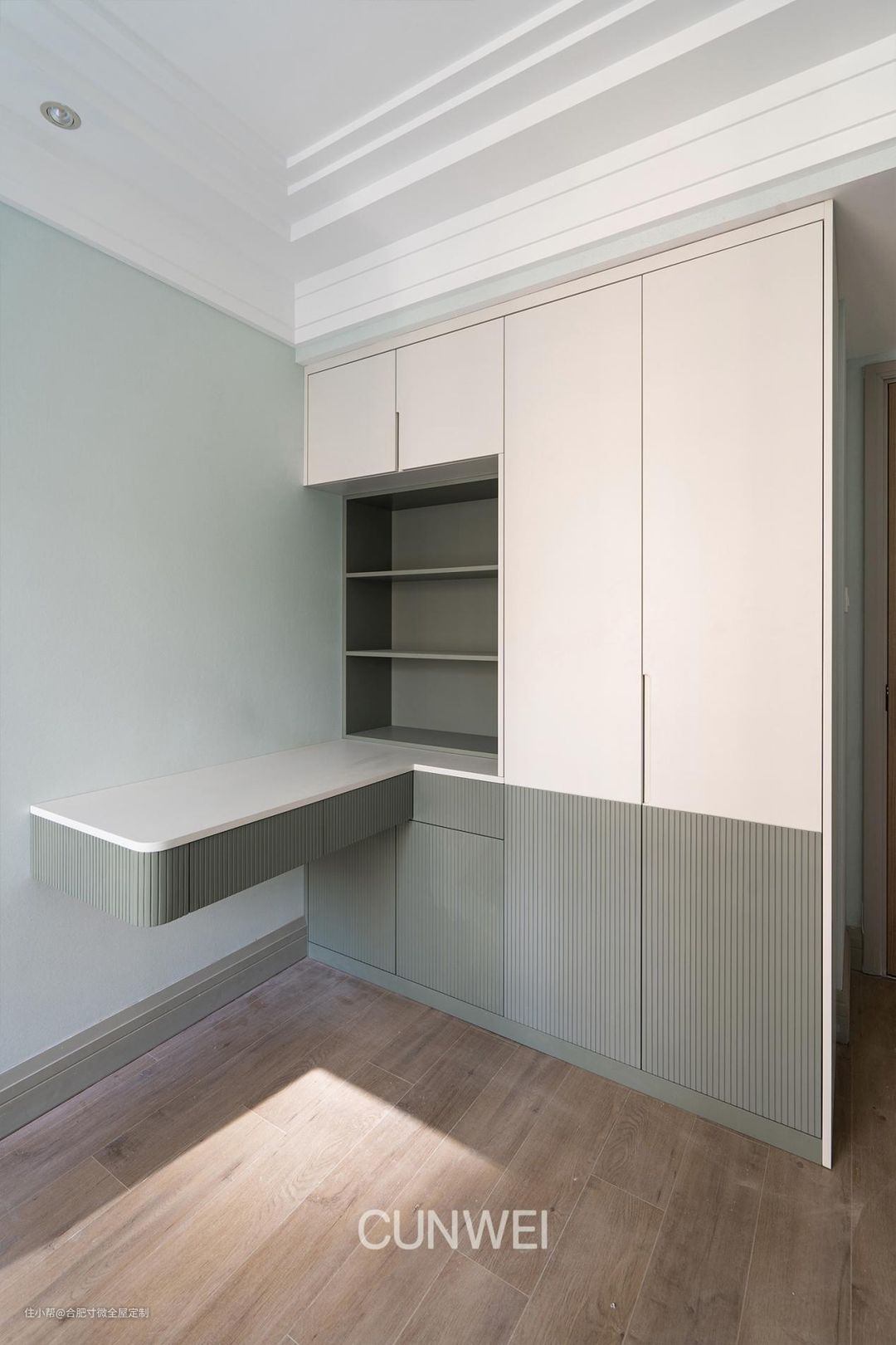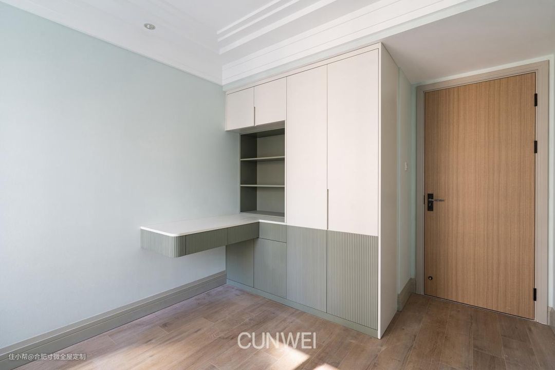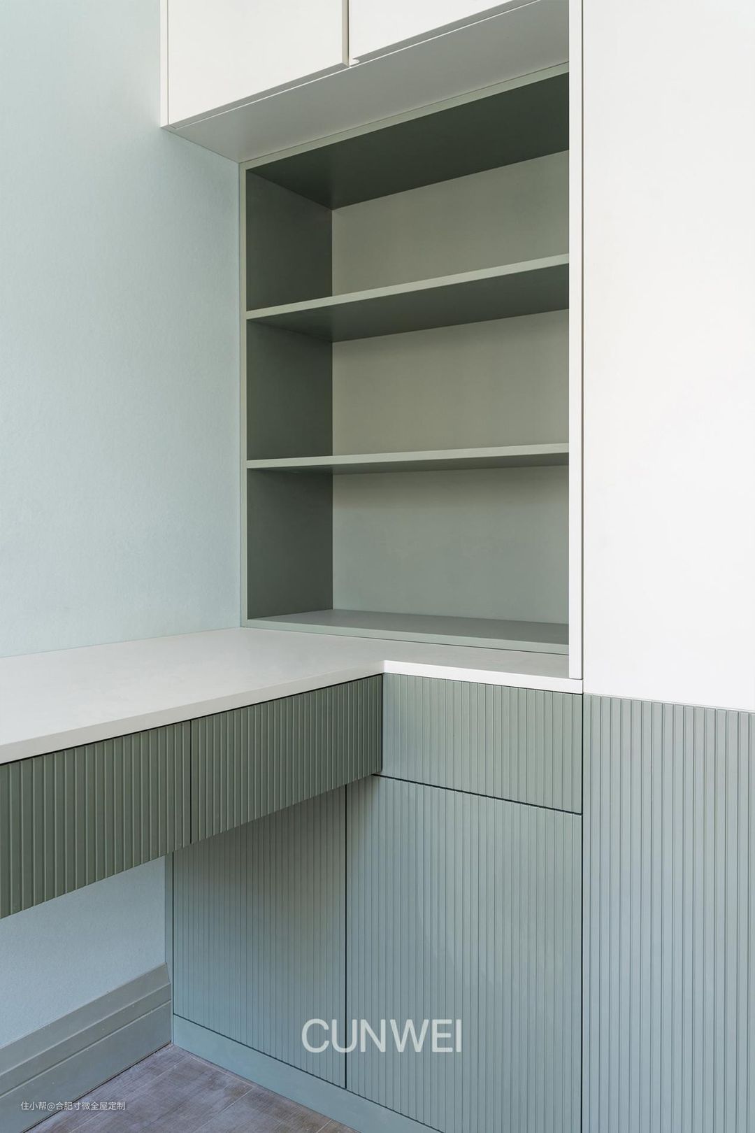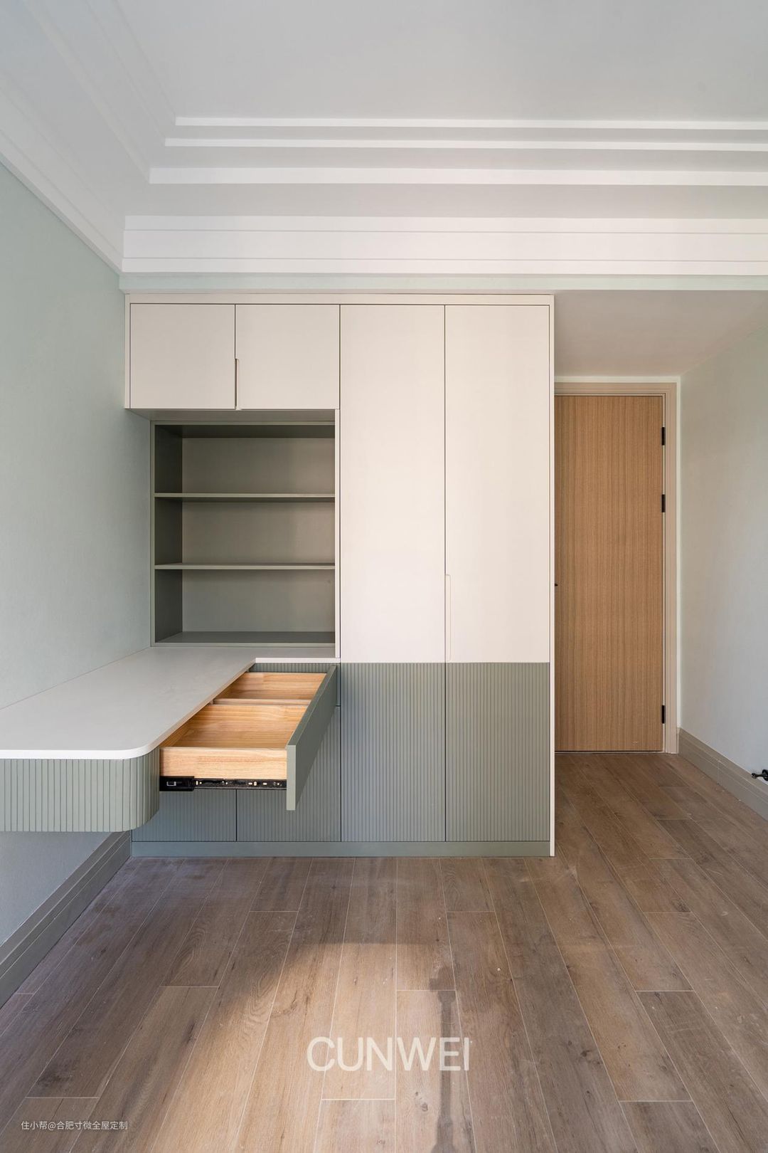 衣柜与书桌转角无缝结合,大大增加了台面使用面积;因书桌是悬空定制,下方衣柜可以不受遮挡使用,多一个储物空间,还方便打扫。