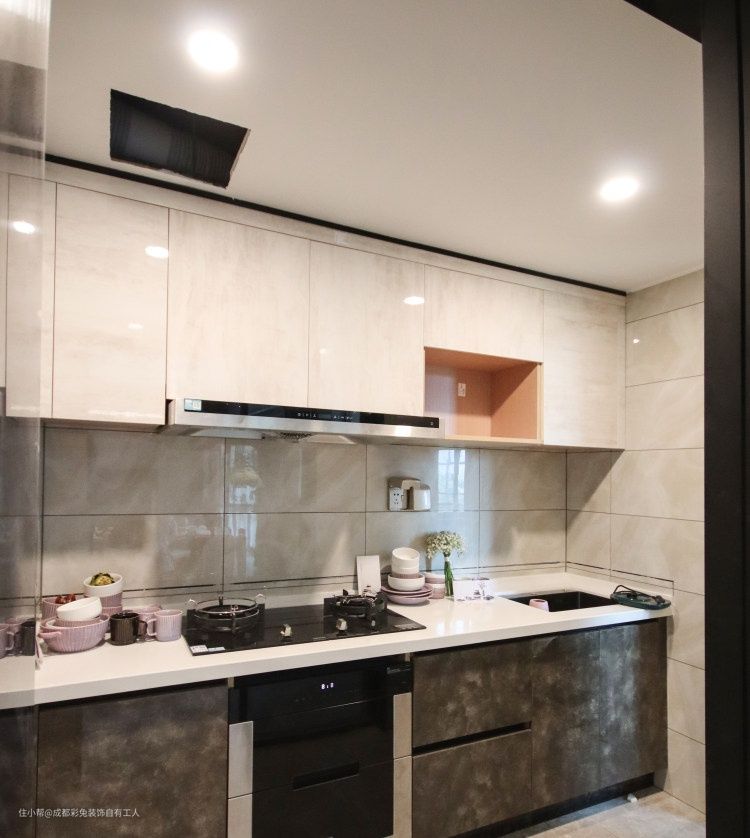 将油烟机嵌装到吊柜底部,可以释放很大一部分操作空间和储物空间,而且视觉上更加整洁,没有压抑感。