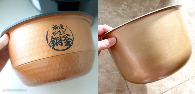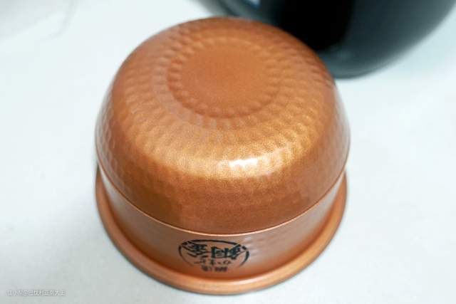 先看内胆材质对比,东芝饭煲最出名的就是他们家的厚釜,我买这款是5mm锻造铜釜,拿在手上很有分量。跟我家电压力锅上那个普通铝合金内胆对比,薄厚度和质感完全不一样。