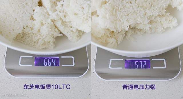 我把两个锅里的米饭全部盛到碗中,对其称重,对比非常明显。同样的水米比,东芝电饭煲煮好的米饭是664g,而电压力锅是572g。这说明高端电饭煲是可以把水分和热量压进米粒中的,所以肉眼看起来更水润饱满。
