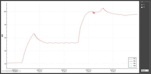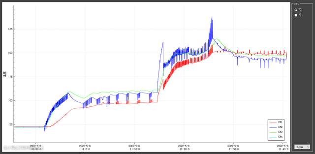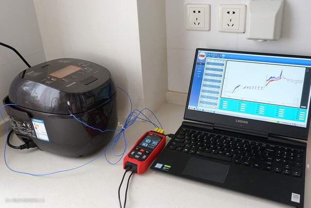 选择电饭煲的标准煮饭模式,最终这三根曲线很有看点啊,红色曲线是上盖,蓝色曲线是底盘,绿色是内胆,我们来仔细分析一下。