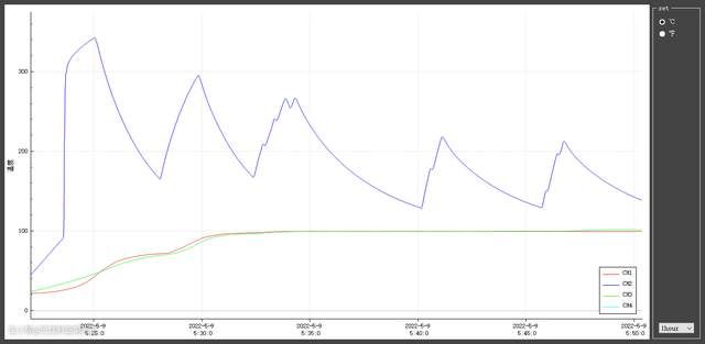 我用同样的方式,给底盘加热的普通电压力锅也做了测试,红色曲线是上盖,蓝色曲线是底盘,绿色是内胆。
