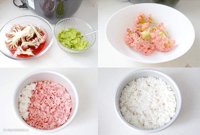 ►红曲粉用水化开,把花菜倒扣泡1小时左右,直接连水蒸熟,大概10分钟。