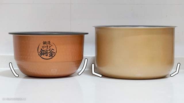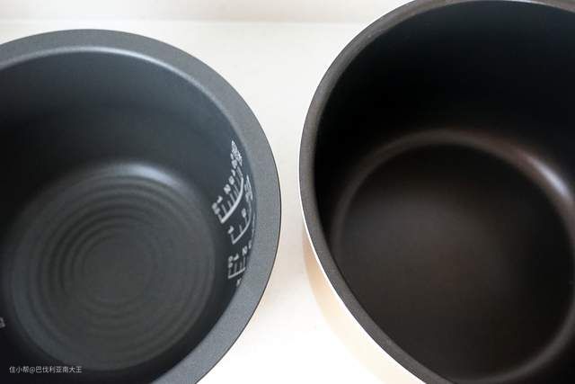 再看内胆形状对比,这两款也非常有代表性,一个是加了弧度的圆形内胆,一个是传统的圆柱形内胆。底部设计一定的弧度,可以加强热对流循环,米饭受热也更均匀,口感自然也会有提升。