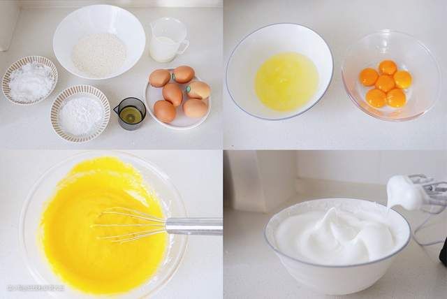 所需食材:鸡蛋6个、低筋面粉120g、玉米油40g、白糖80g、玉米淀粉10g、牛奶90g