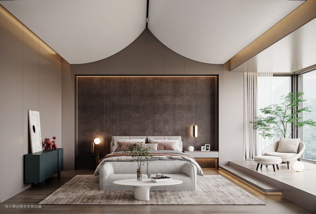 步入卧室,拱形吊顶带来的设计感与艺术气息扑面而来。卧室配套阳台同样纳入了地台设计,增加了空间层次感,让生活氛围更加舒适自如。