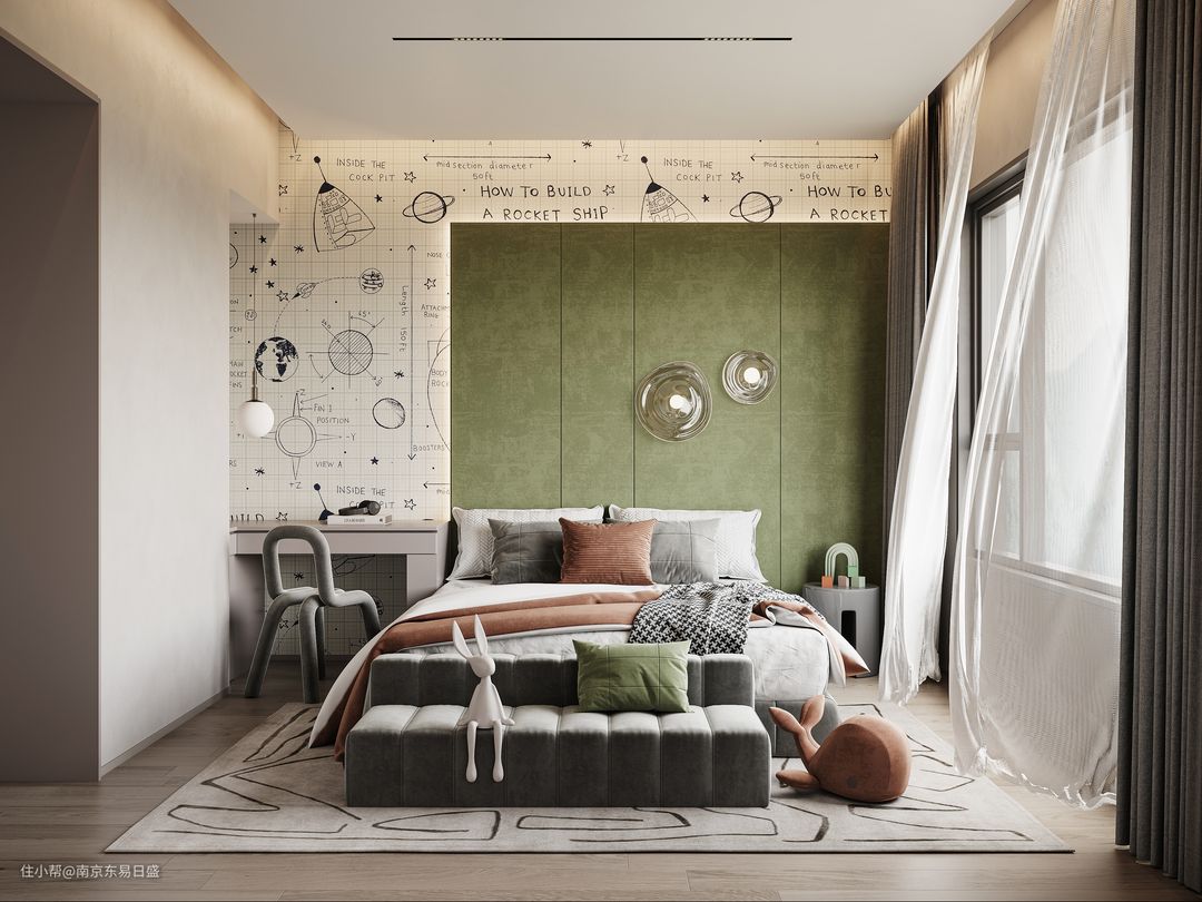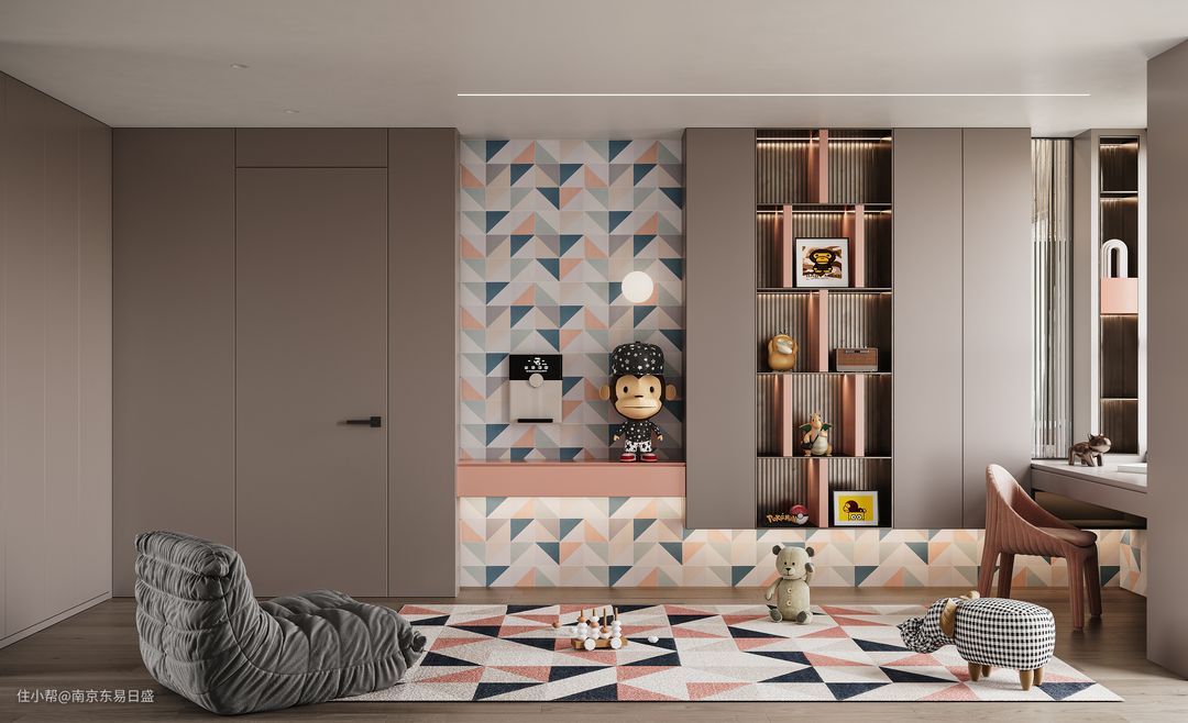 在儿童专属的玩耍区中,家里的小朋友可以尽情释放自己的天性,藕色、墨蓝色填充着几何图形,地毯与墙纸相互呼应,创意十足。