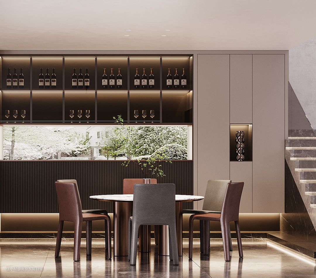 餐厅一侧添置了定制镂空开放式储物柜,能够将屋外的景色融入其中,设计构思十分独特巧妙。