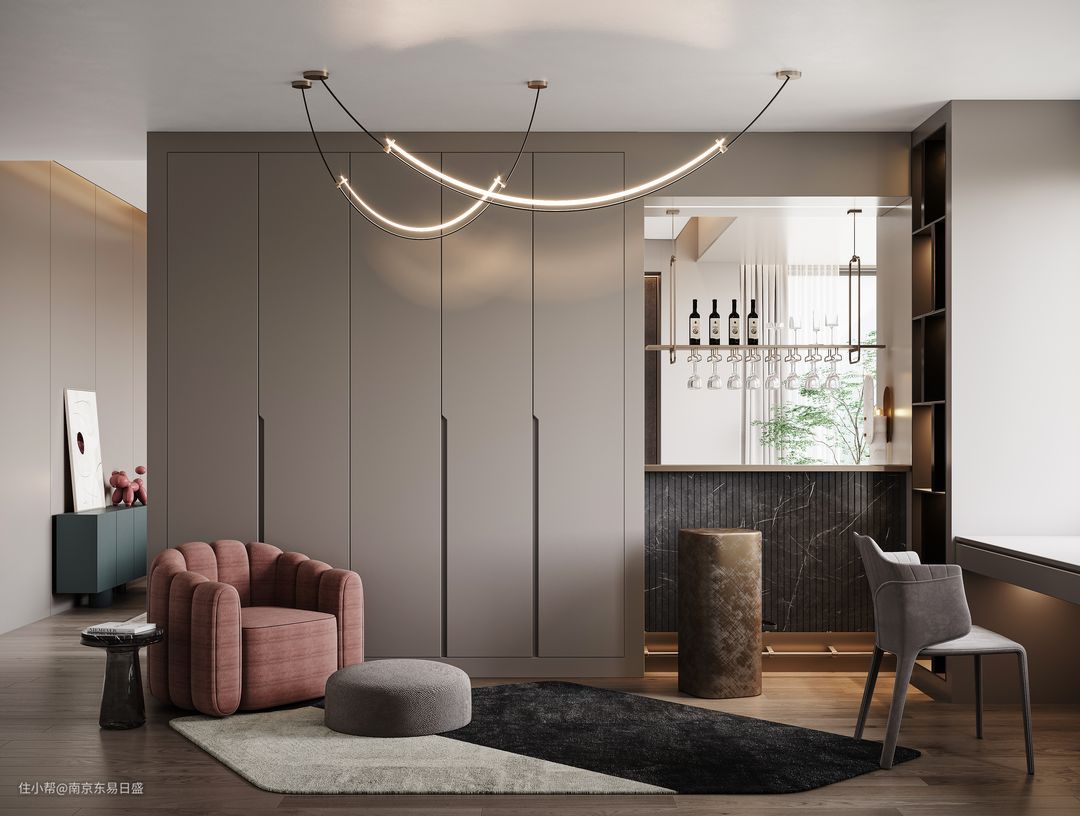 靠窗一侧设计了悬挑桌面,加上双人吧台,方便业主平时DIY调制美酒招待三五好友。
