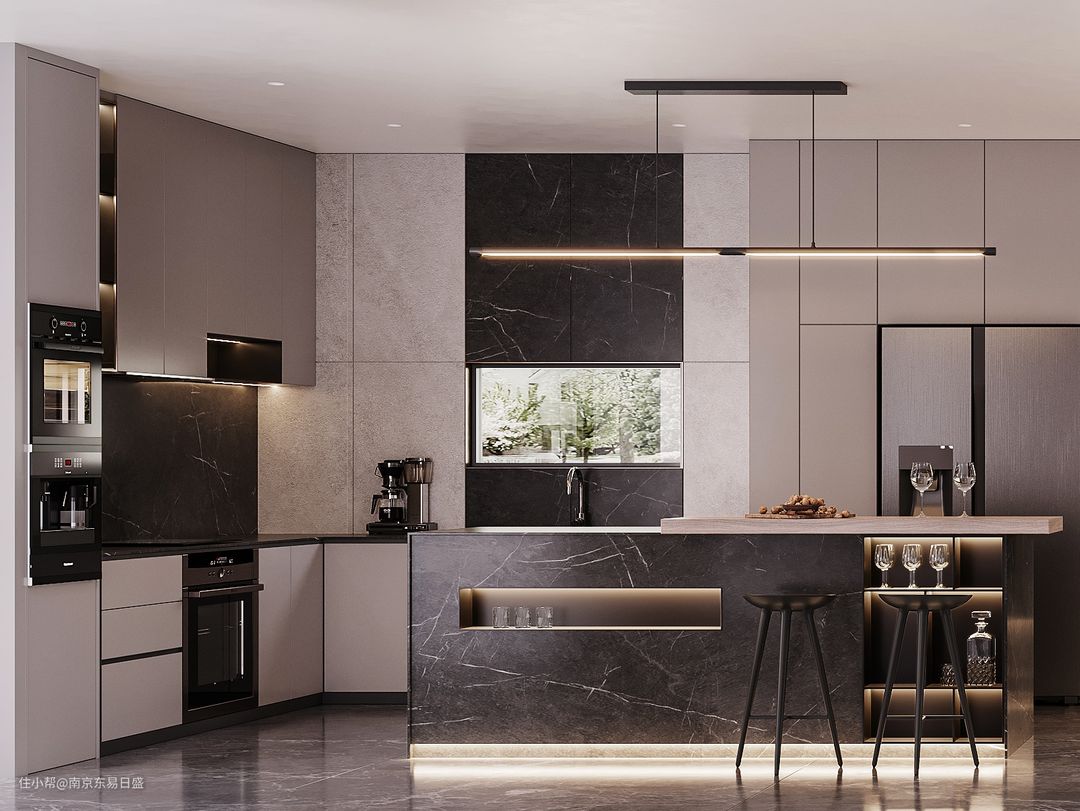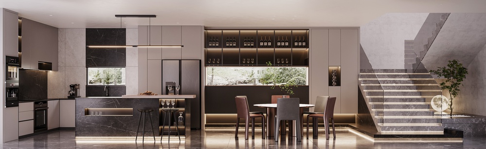 餐厨空间动线明朗,吧台设计既提供了准备简餐的区域,又隐形增加了收纳储物空间。