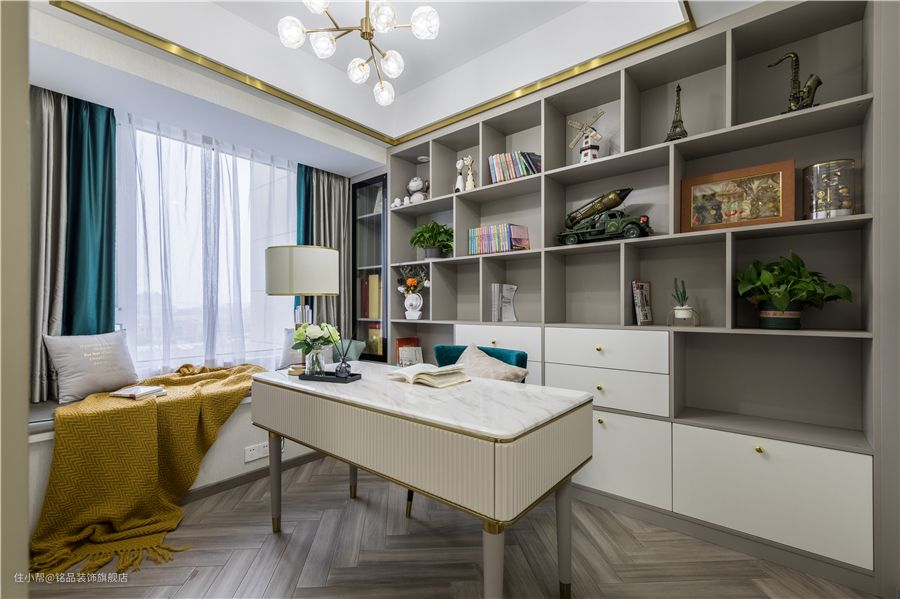 最后,还有一个小建议。我们可以巧妙地利用书房的角落,比如把书桌放在角落里,这样我们就可以用两堵墙。学习用品也可以放在书桌上,书架可以放在书桌上方,不仅可以有效利用空间,而且使用非常方便。