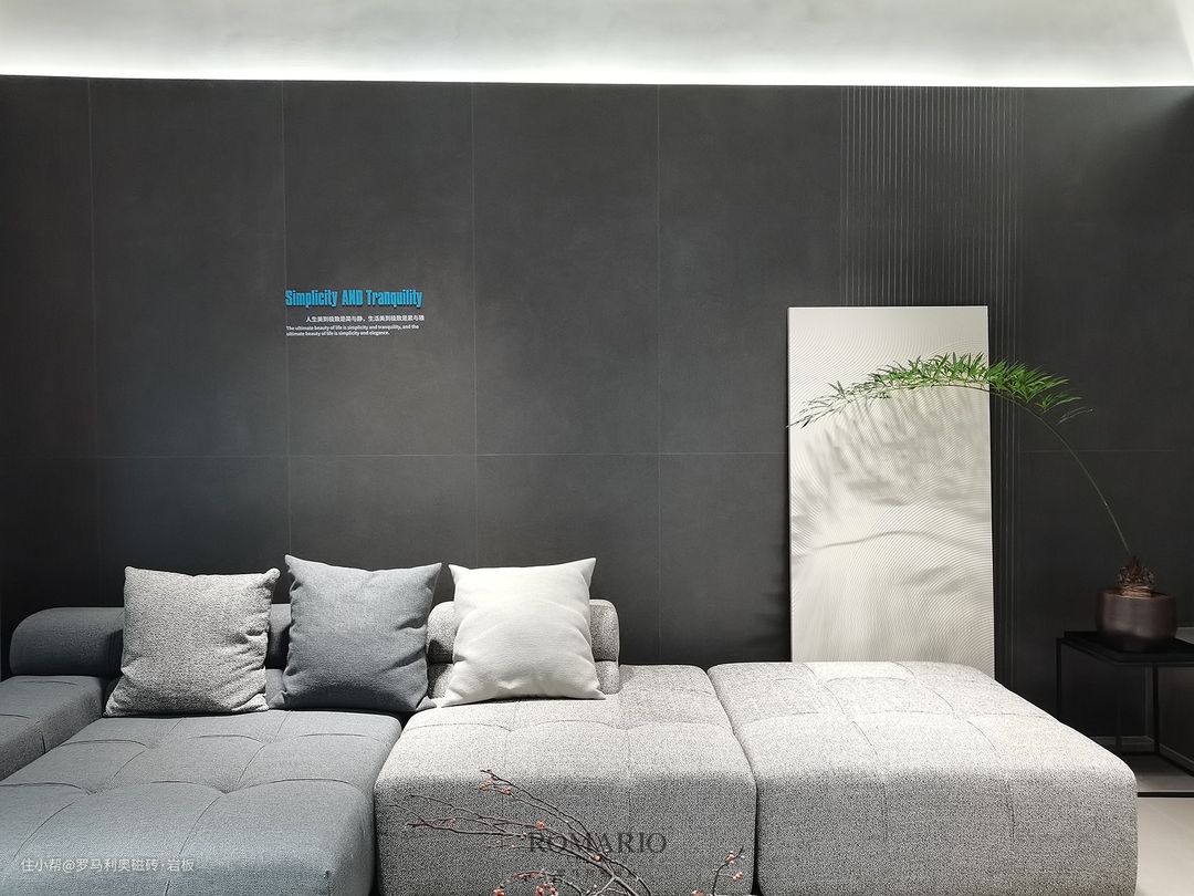 沙发背景墙选用了900x1800mm规格的至尊玛瑙灰,个性张扬的纹理,充满自然野性,赋予空间无限生机。高光感墙地面搭配素雅简约的软装,处处散发通透淡泊的风度。