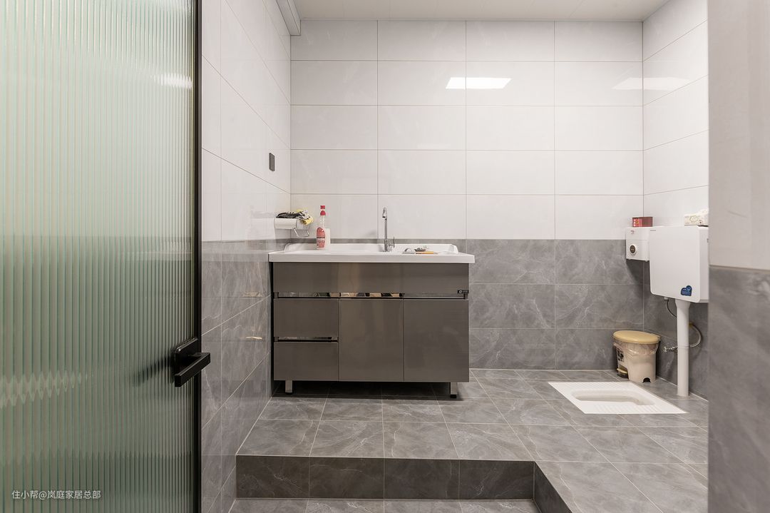公卫的空间较大,也加入了家政间的功能,是L型的布局,一侧装浴柜,角落里反而选择了蹲便器,右侧则是放置了洗烘一体机,有效利用空间。